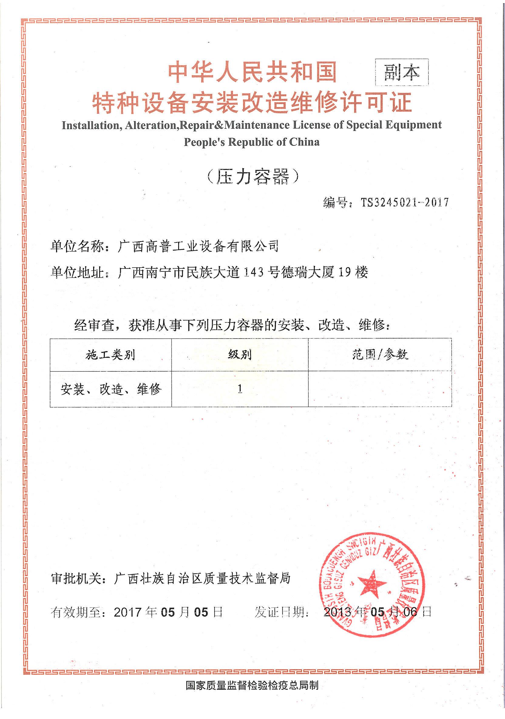 本公司是高新技術企業,持有國家技術監督局頒發的1級《特種設備安裝、改造、維修(鍋爐)》許可證,1級許可證是最高級別,可安裝、改造、維修任何形式、參數的鍋爐設備。并持有《壓力管道》安裝、改造維修許可證,1級《壓力容器》安裝、改造、維修,機電設備安裝工程專業承包3級等資質。